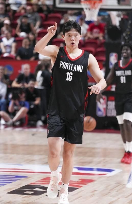 开拓者队球员杨瀚森(中)在比赛中。新华社发